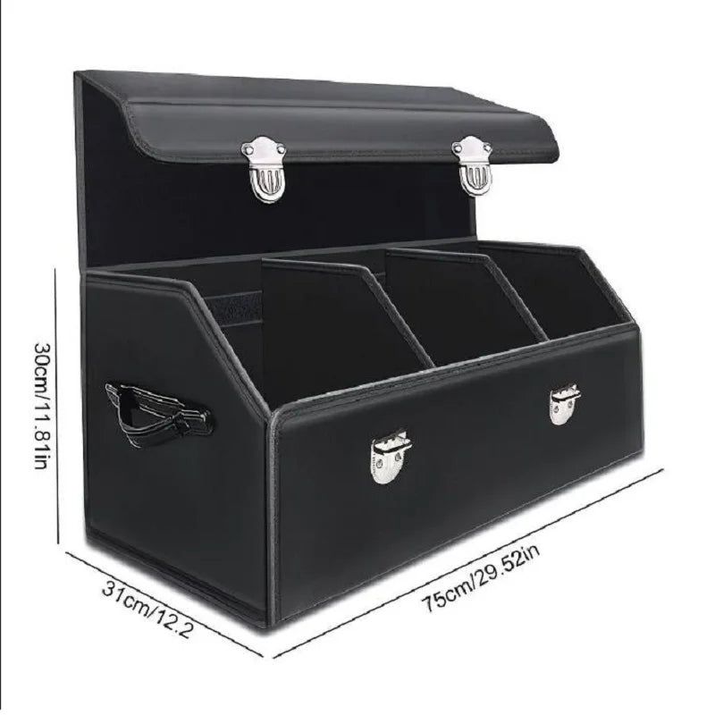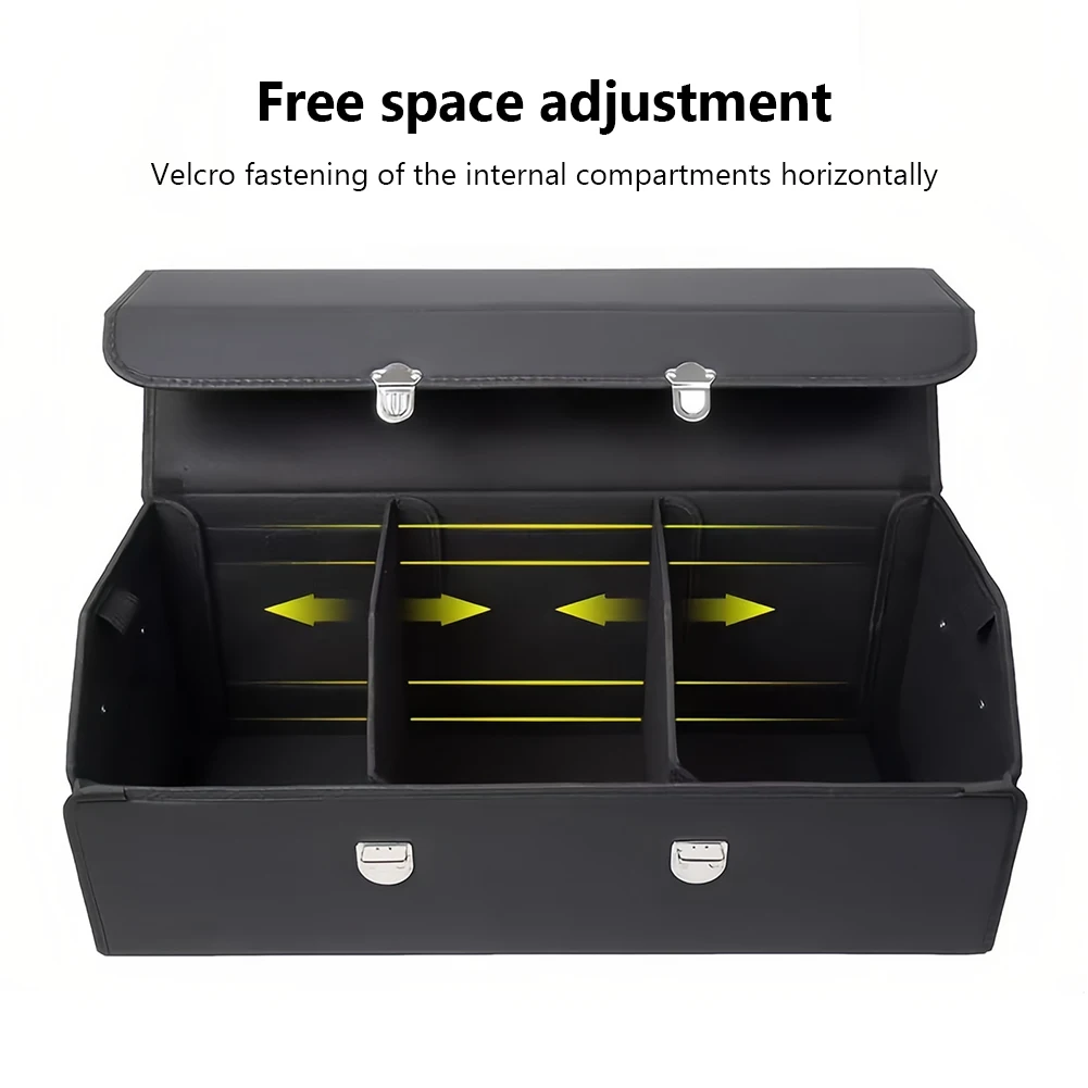 2. Construction: Made with a premium waterproof leather exterior, a sturdy high-density board core, and a suede interior lining, this auto multiues tools storage box features a pyramid structure that withstands heavy loads without collapsing. It is sturdy and odor-free when storing items.