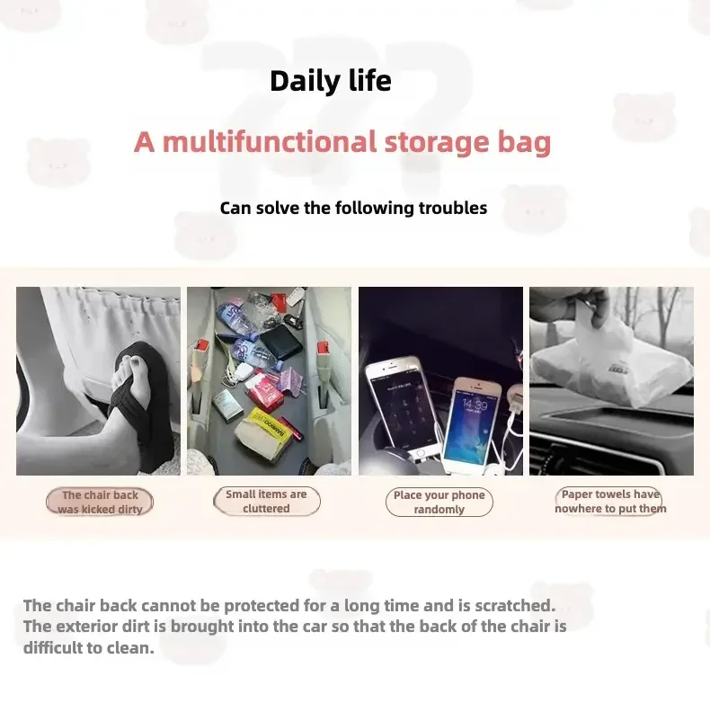 Leather Deluxe Car Seat Back Organizer-Multi-Function Storage, Foldable Dining Table Tray,Anti-Kick Pad, Sweet Bunny, Lucky Bear