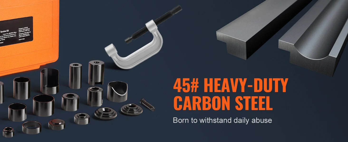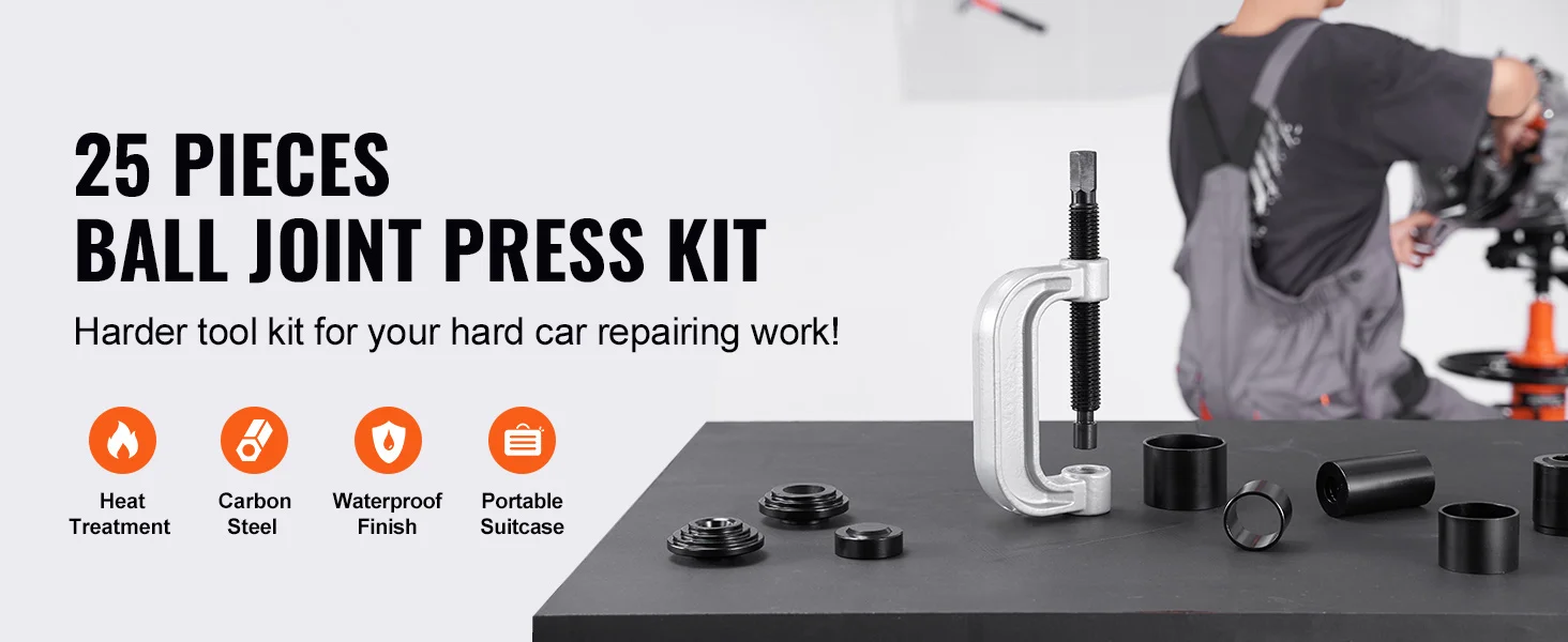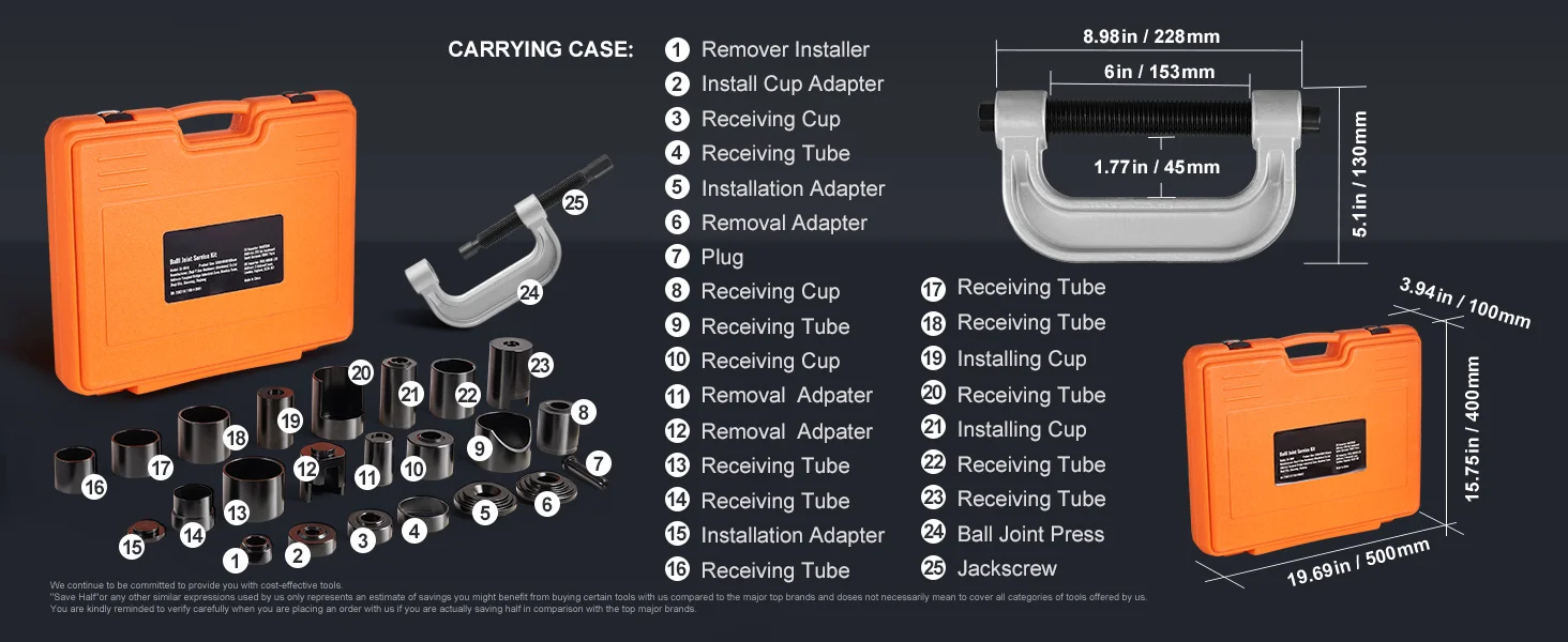 Our 25-piece ball joint tool kit is made of high-performance carbon steel and treated with a professional heat process for maximum strength and longevity.