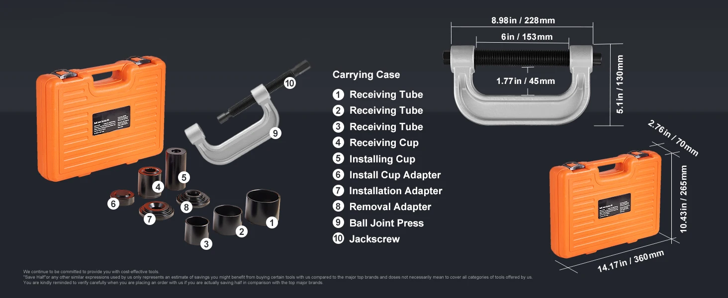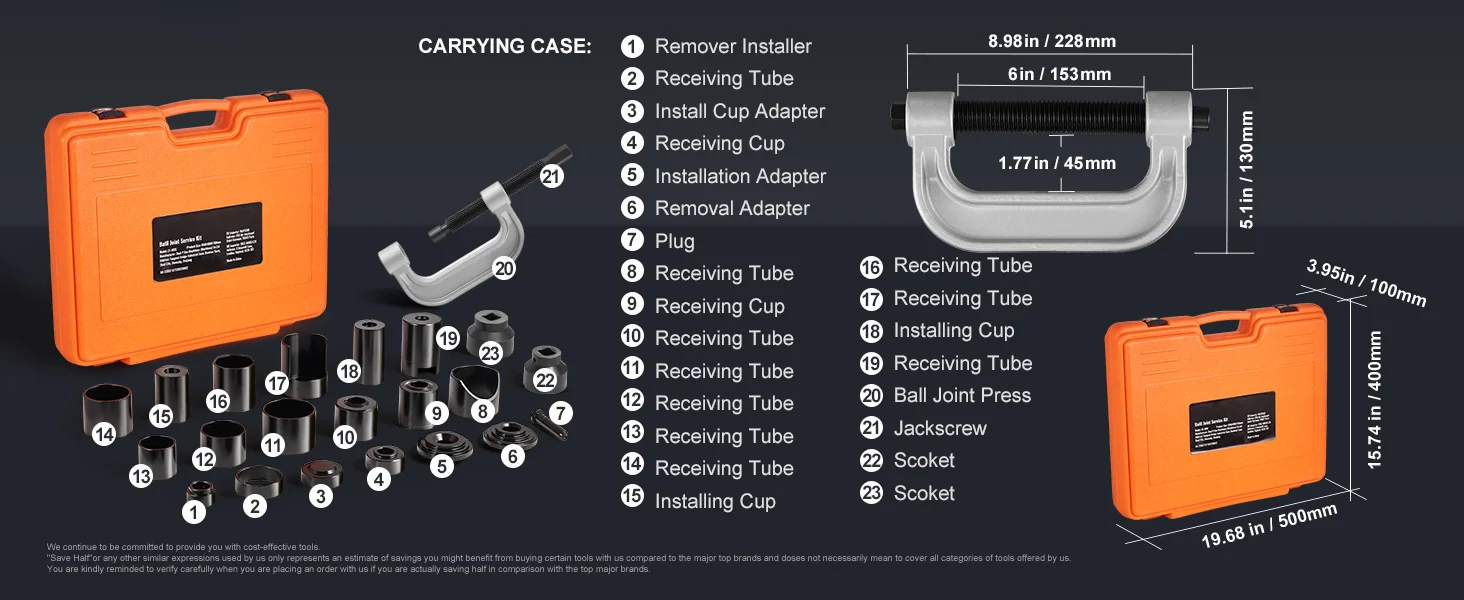 • What’s in the Package: Our 25 pcs ball joint kit includes 9 adapters, 1 plug, 1 ball joint press, 1 installation adapter, 1 installation cup, 1 installation cup adapter, 1 receiving cup, 7 receiving tubes, 1 removal adapter, 1 screw and a socket. With these tools at your disposal, you'll have a professional car repair assistant that can help you get the job done right.