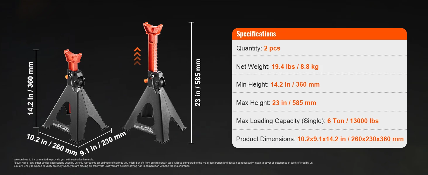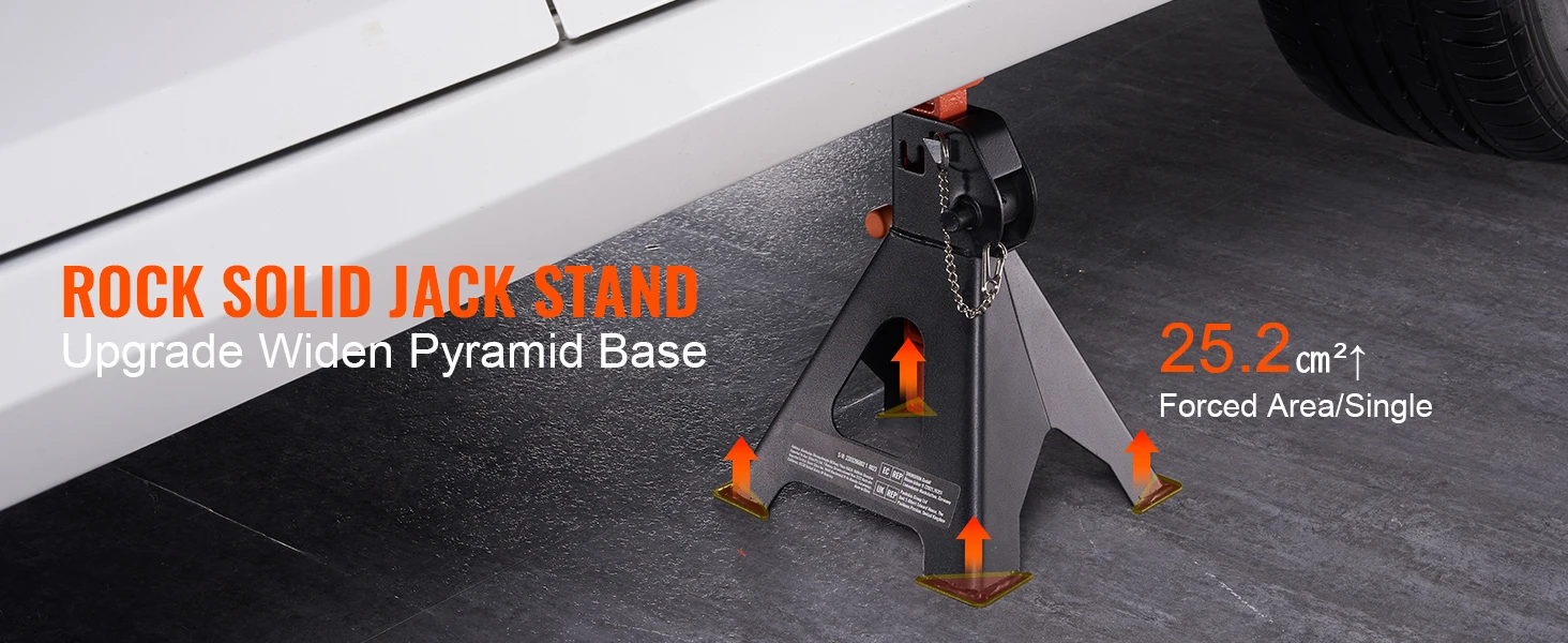 Give Your Vehicles a Lift: Our jack stands now have a powerful load-bearing area that is four times larger, thanks to the wide pyramid base and triangular foot pad! Additionally, the notched saddle top of the ratchet bar perfectly fits the edges of the vehicle, providing a stable and secure grip.