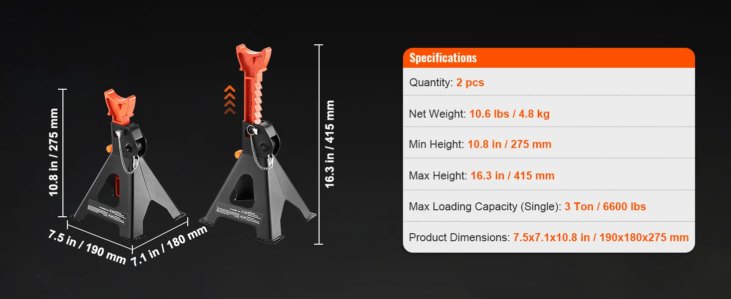 For All Your Lifting Needs: Our 3-ton jack stands have a flexible range of 9-level adjustable heights, ranging from 10.8 inches (275mm) to 16.3 inches (415mm). All of your heavy projects will be within your limits! The wide lifting range meets your lifting needs, regardless of whether the underbody is low or high!
