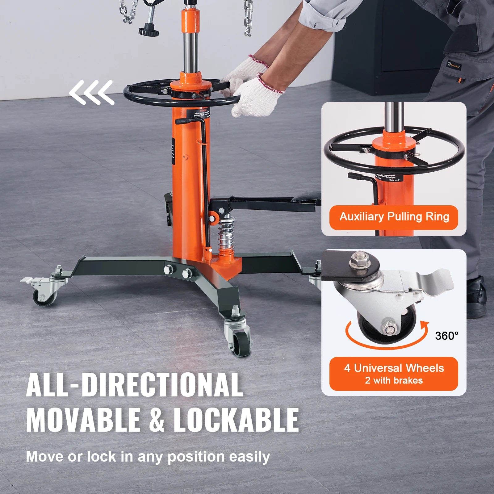 • Movable & Lockable: SucceBuy's transmission jack has 4 wheels, 2 with brakes. An auxiliary ring eases movement. Lock the wheels to stop sliding during use.