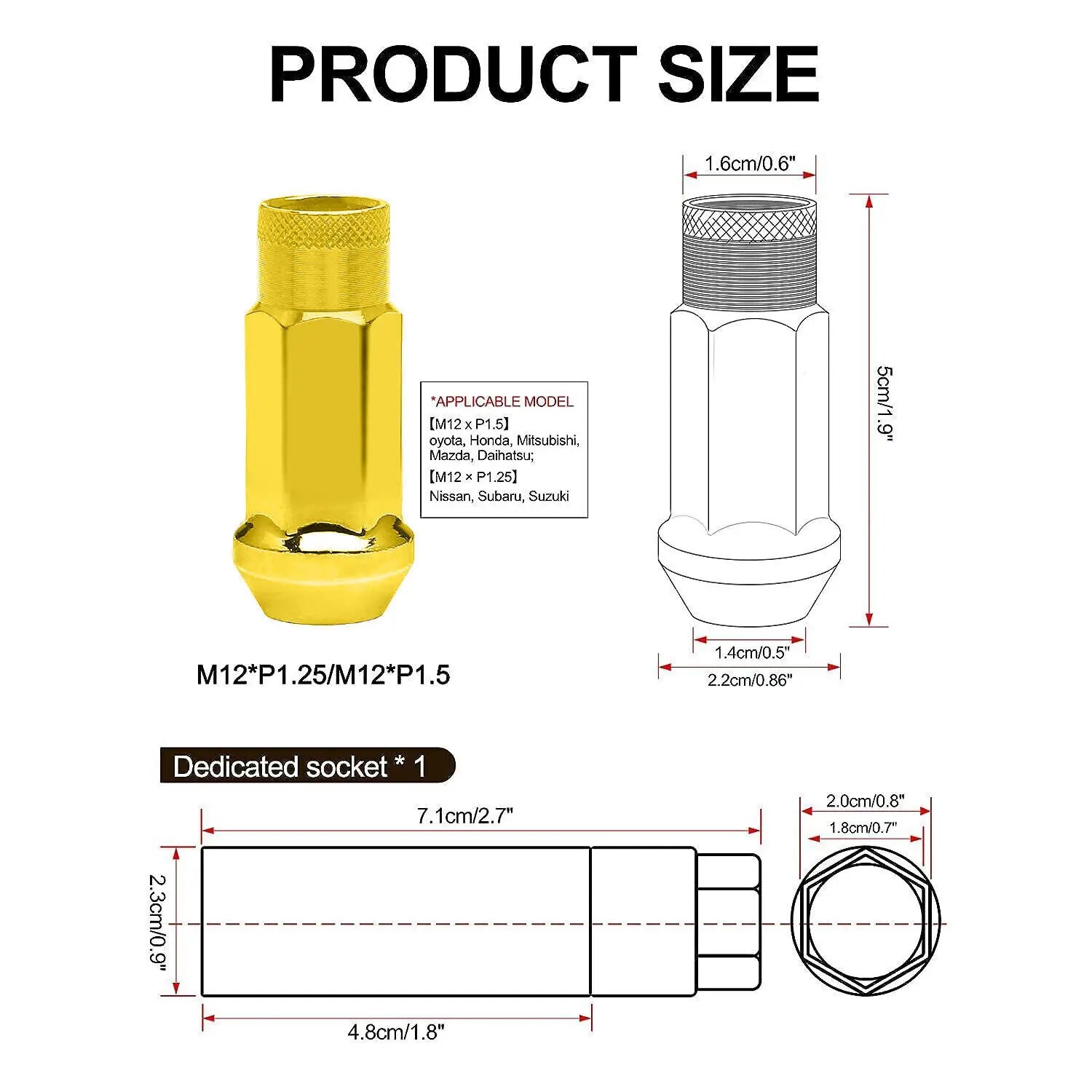20pc 48mm Steel Wheel Lug Open End Extended Nuts Set M12x1.5mm + Key For Honda Toyota Mitsubishi Mazda Ford Kia Hyundai Chevy Buick Not For Wheels With Mag/Ball Seats