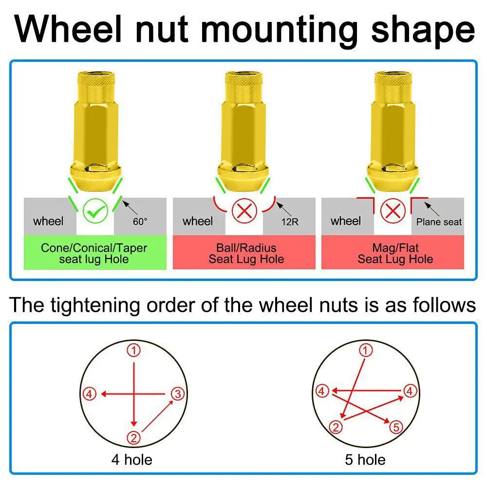 Colors and Performance: The nut is processed by acid-resistant aluminum, and the dye is penetrated in the small hole and the color is directly colored.The screw part of the nut is also firmly fixed on the color, and the coating is not easy to fall off, reducing rust in long-term use.The nut is a consumable, please tighten it for 100 kilometres.Different batches may have chromatic aberration.Technology: One-piece design brings wheel nuts the advantage of Anti-cracking off and make it aesthetically pleasing while ensuring safe driving compared with other two-piece design.